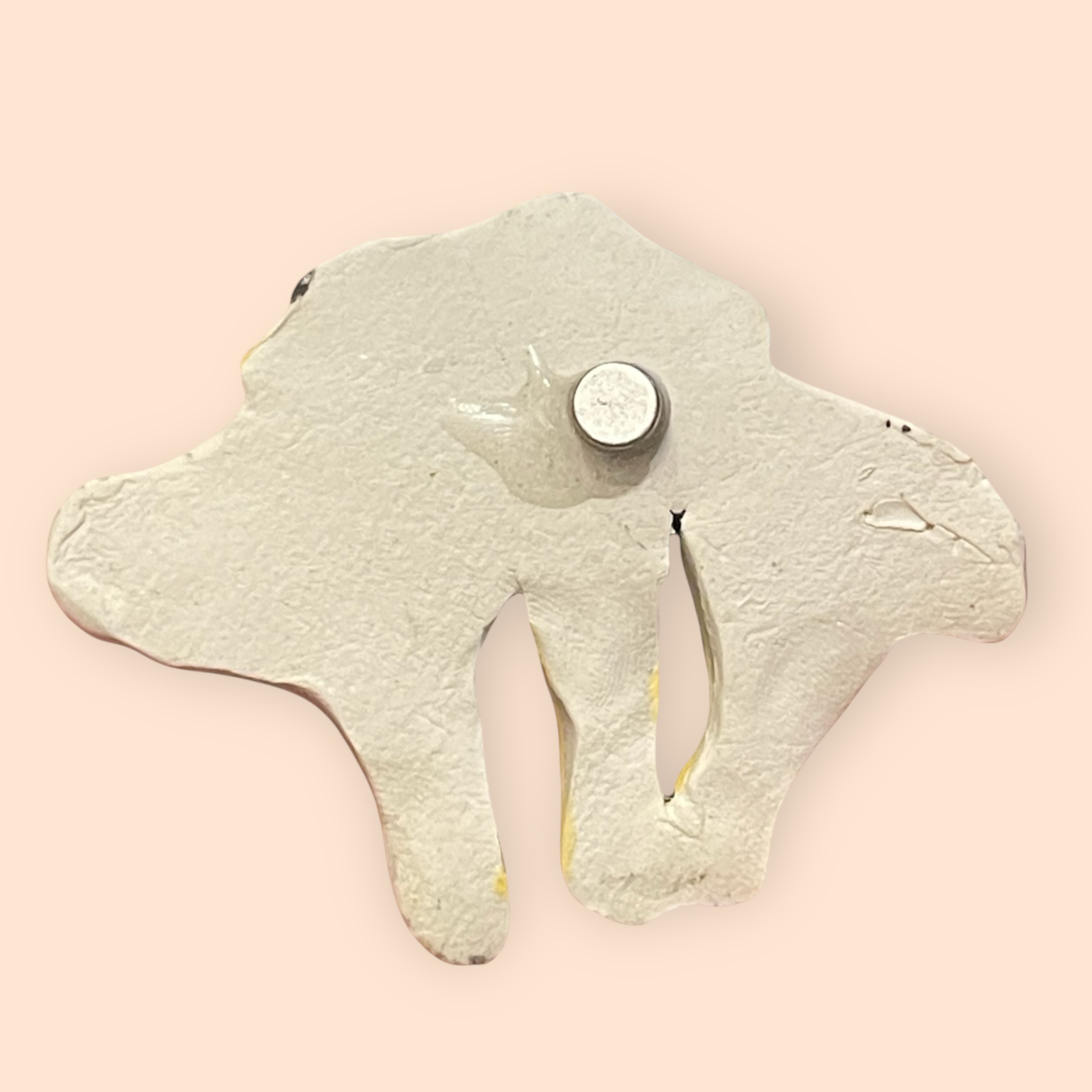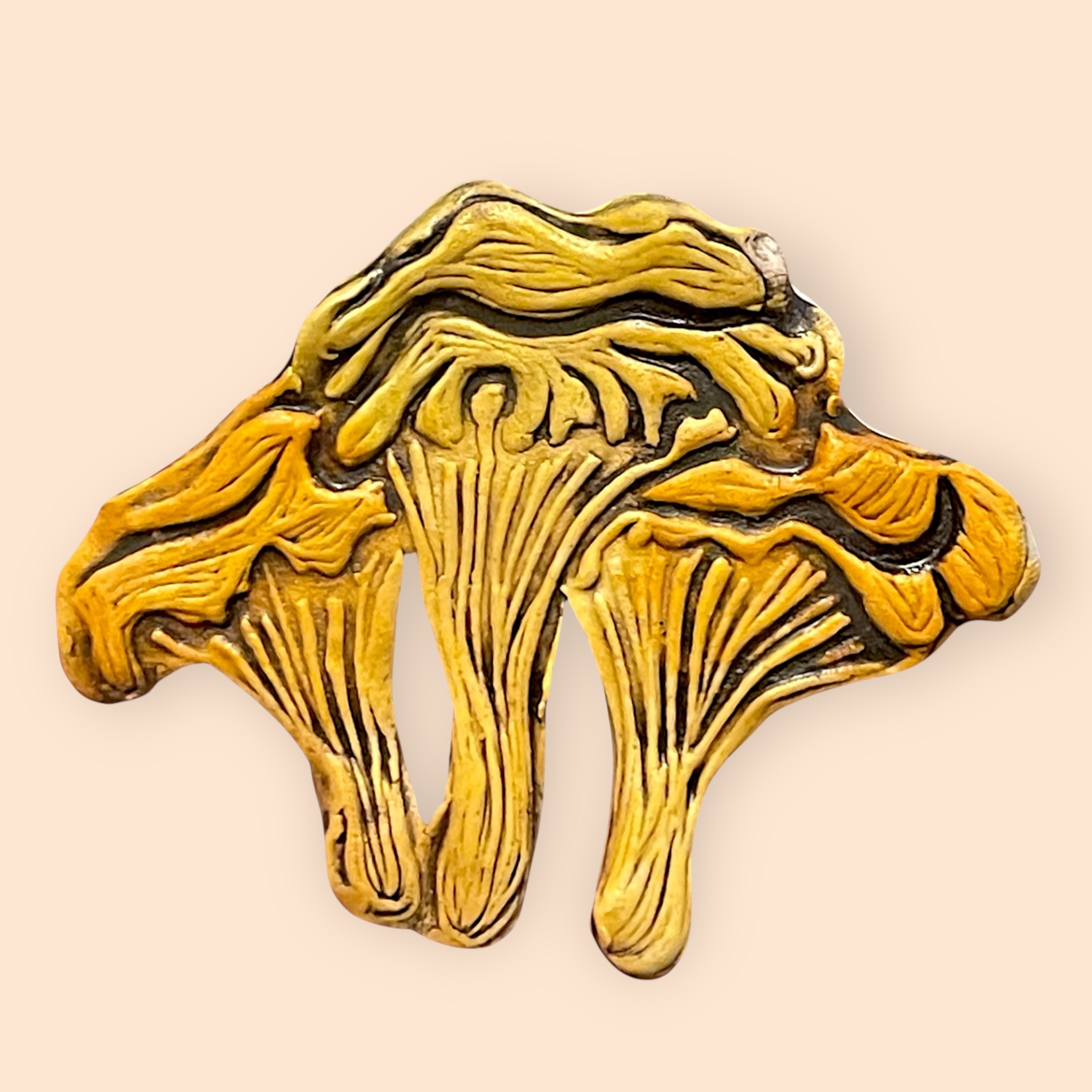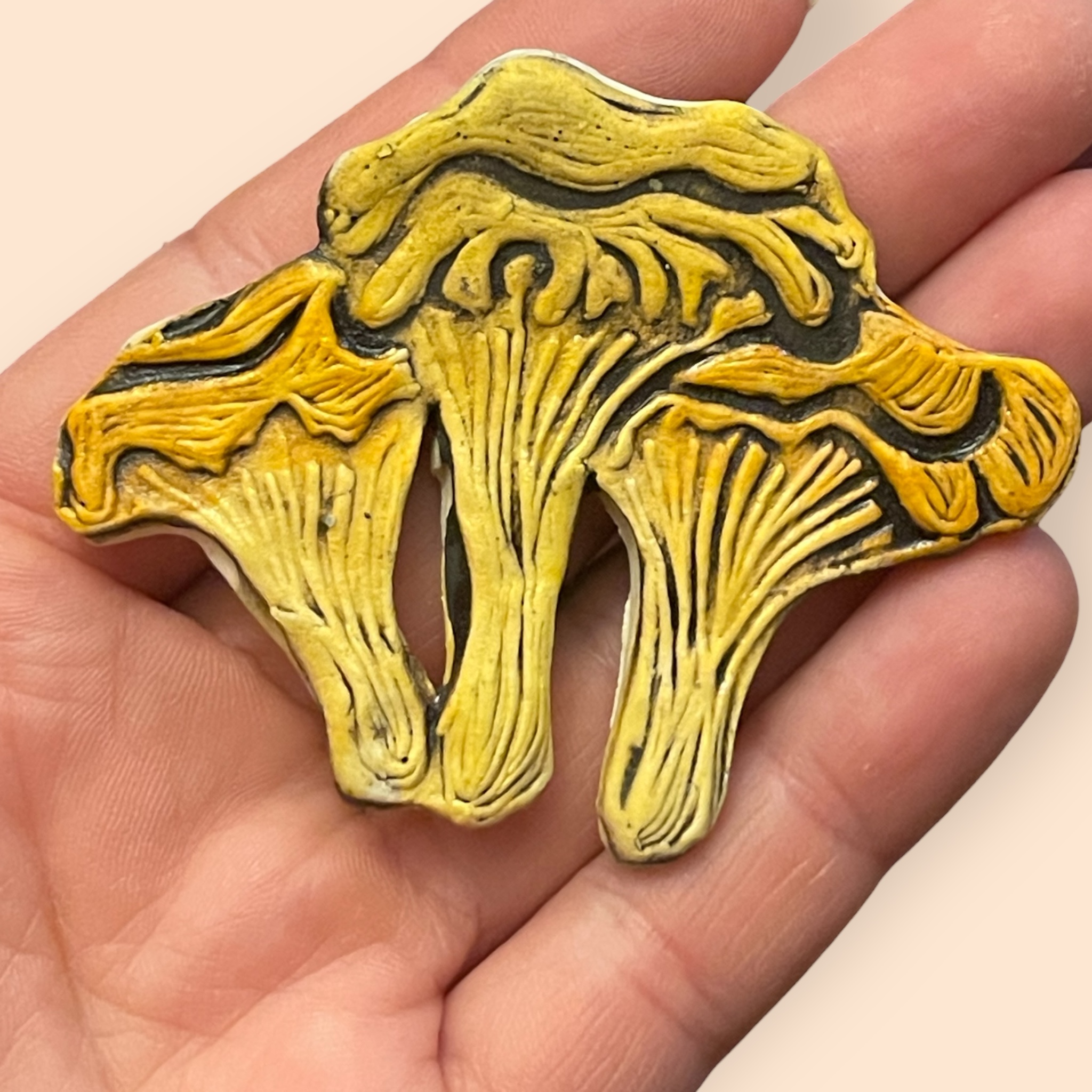 Chanterelle Magnet. This magnet design was created with a linoleum carving that was pressed into clay, cut out and additionally hand painted with the base colors, making each magnet one of a kind and unique. After the bisque firing, the magnet was painted black, and then wiped off to inlay the black underglaze into the grooves. The magnet was then painted with clear glaze and fired again, then finished off with a powerful magnet on the back.
