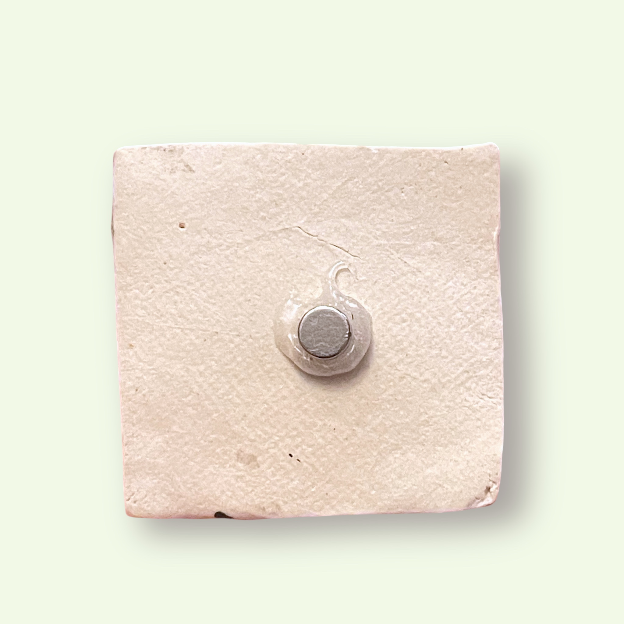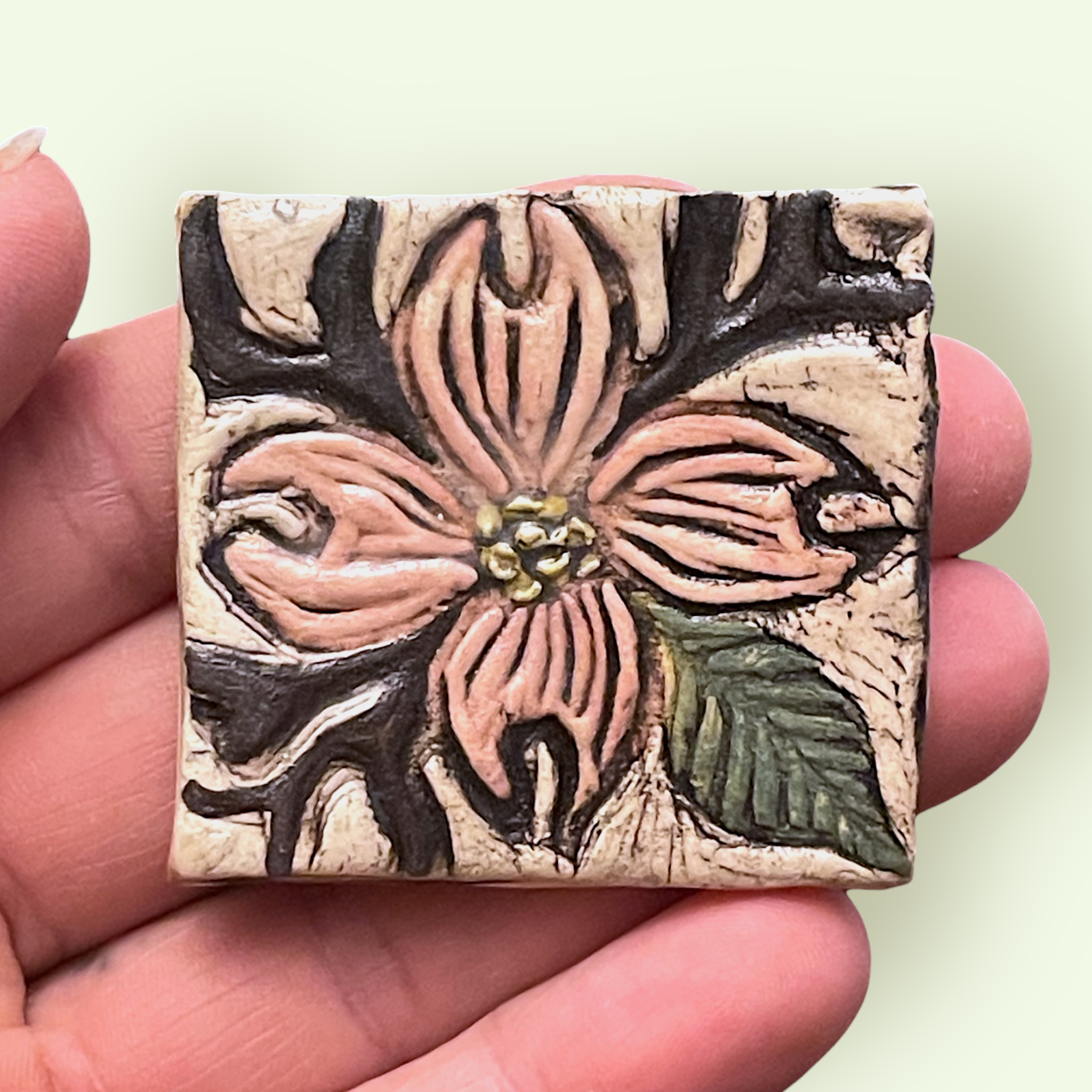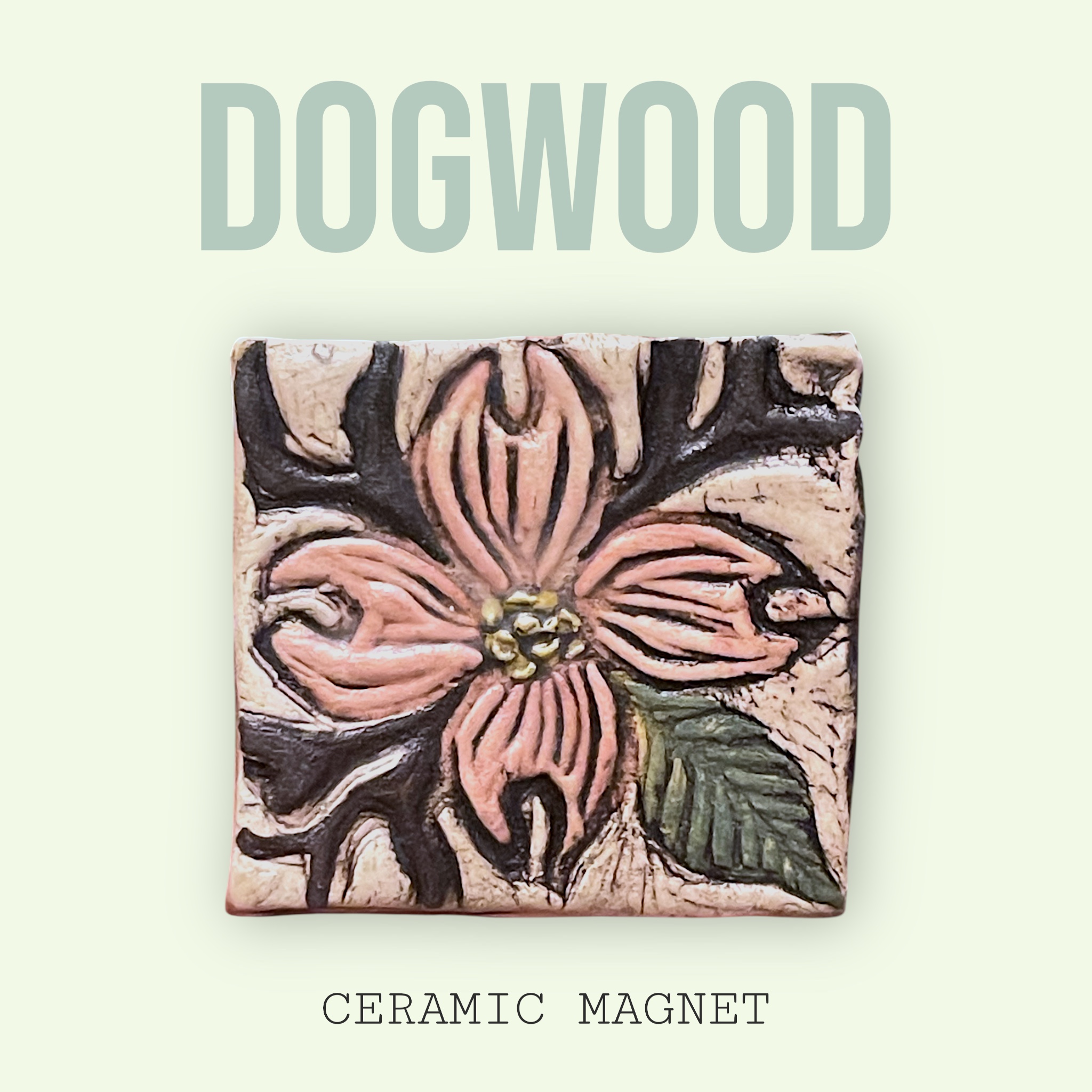 This magnet design was created with a wood block carving that was pressed into clay, cut out and additionally hand painted with the base colors, making each magnet one of a kind and unique. After the bisque firing, the magnet was painted black, and then wiped off to inlay the black underglaze into the grooves. The magnet was then painted with clear glaze and fired again, then finished off with a powerful magnet on the back.