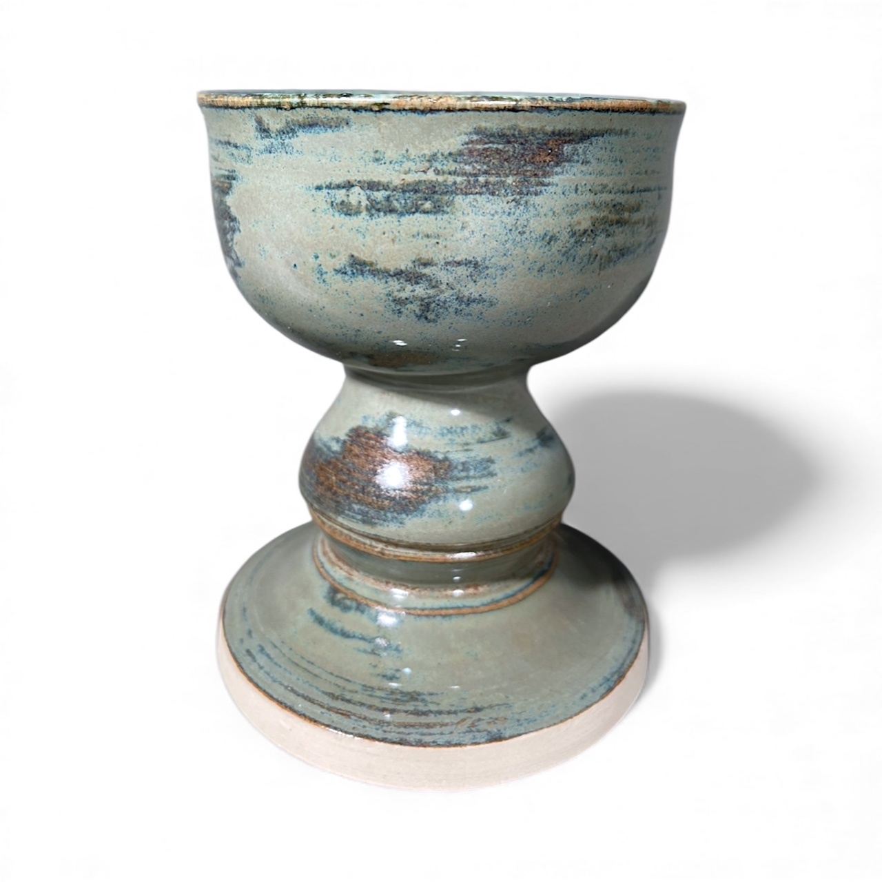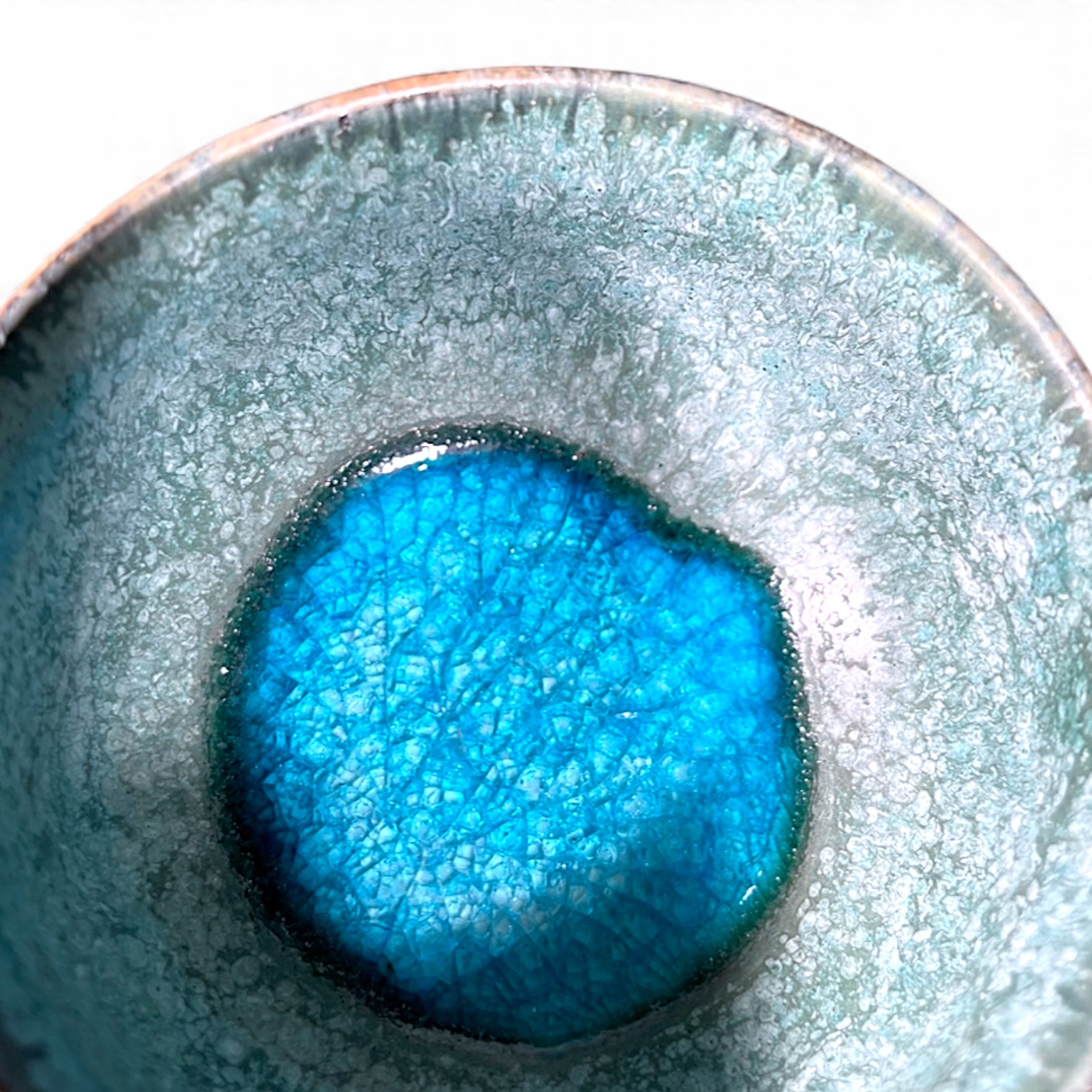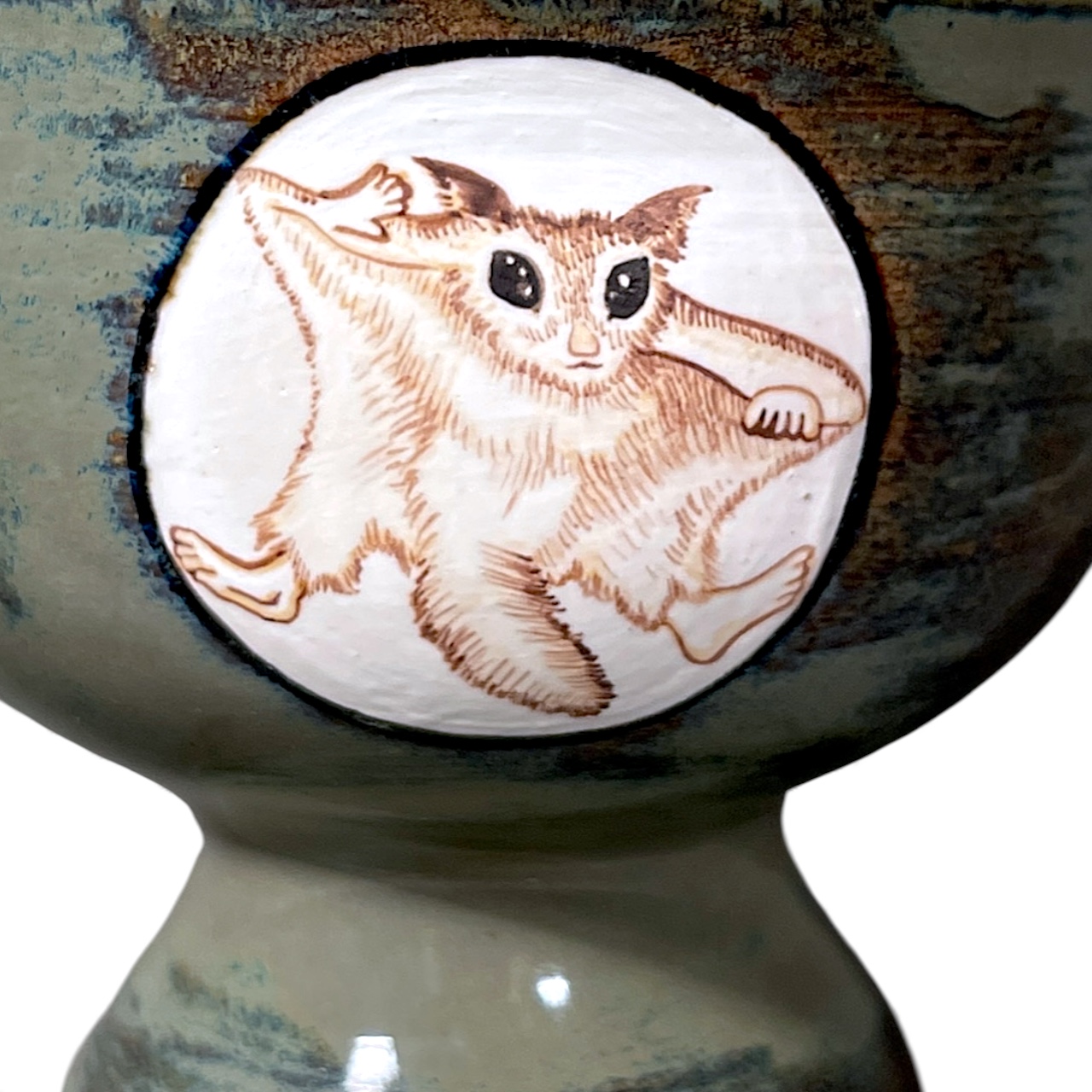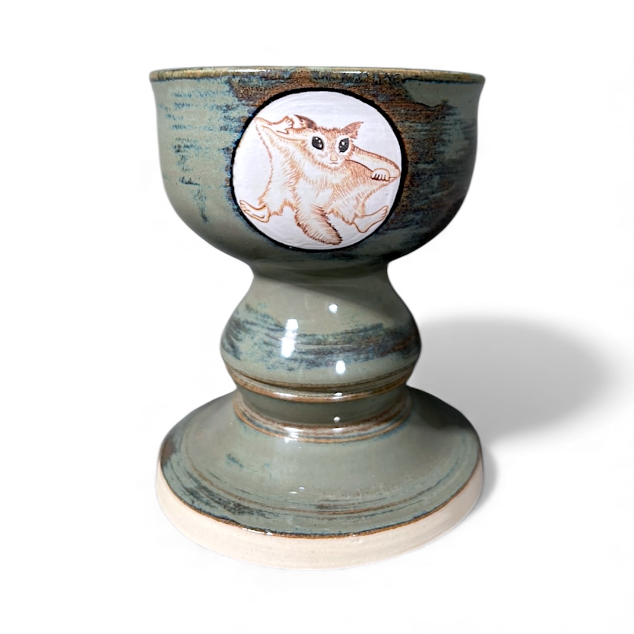 Flying Squirrel Goblet. This one of a kind goblet design was created by free-hand painting the surface with underglaze paints. Glass was melted in the center to create a watery pool effect. It is microwave safe, dishwasher safe, and made with love, and will bring an element of beauty and magic into your daily routines.