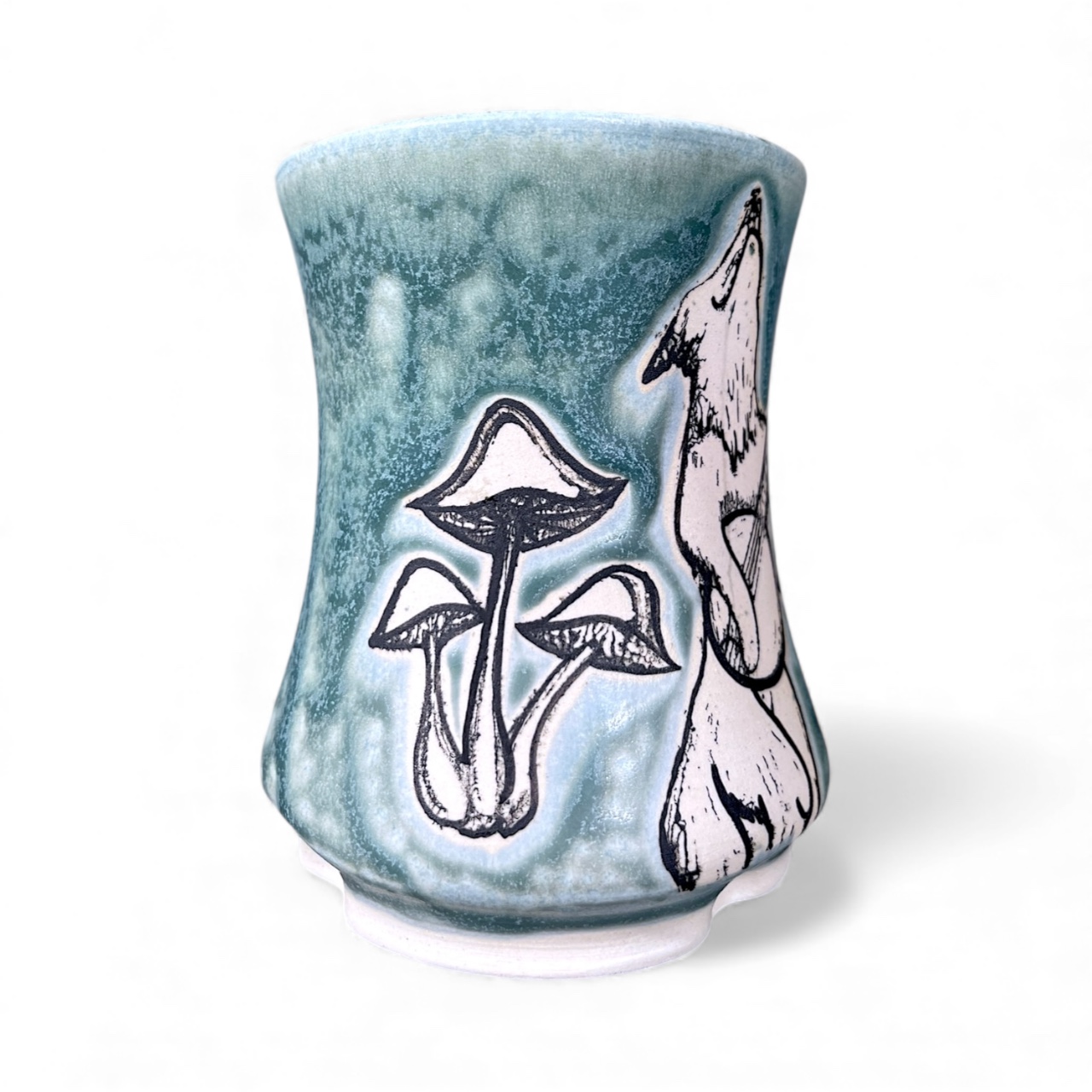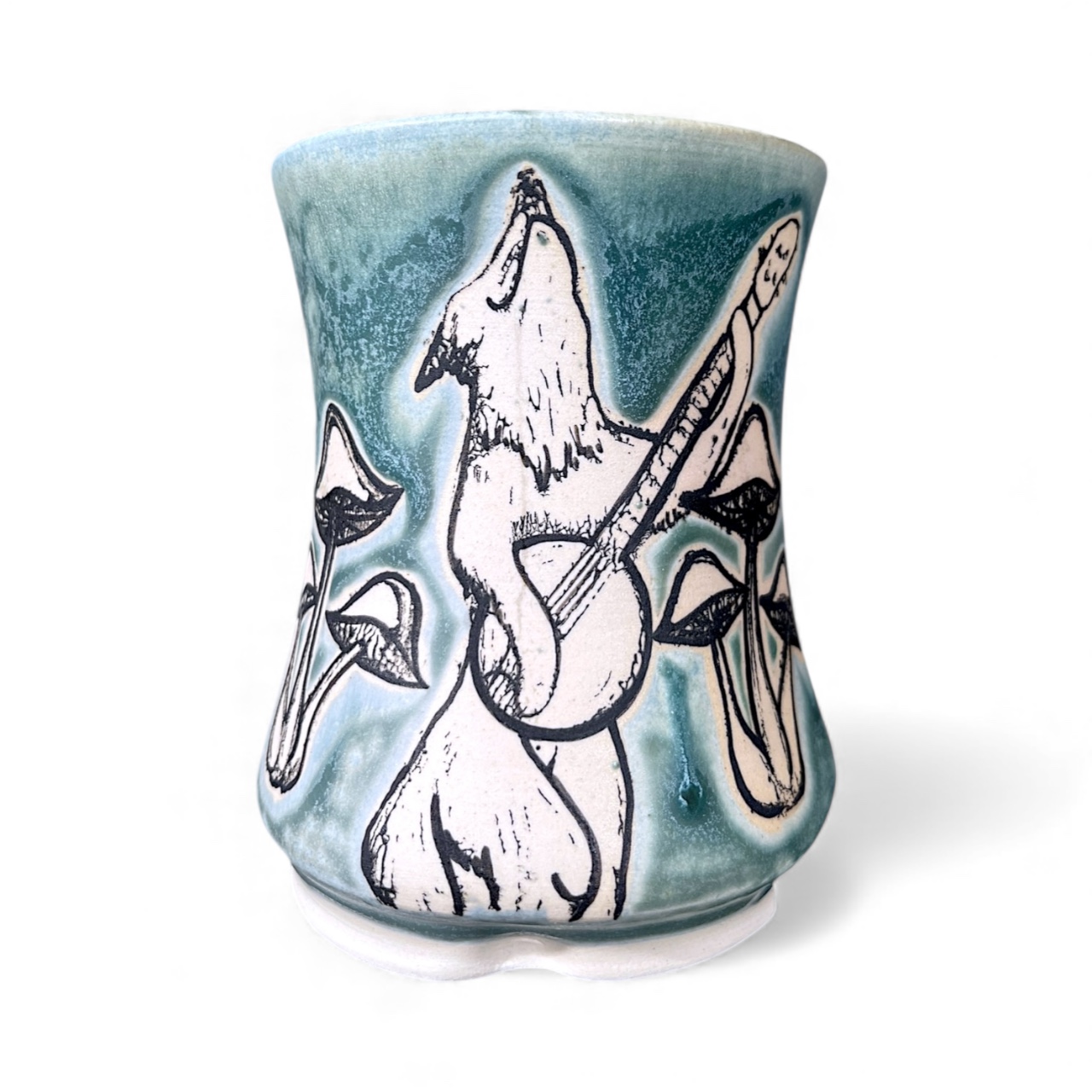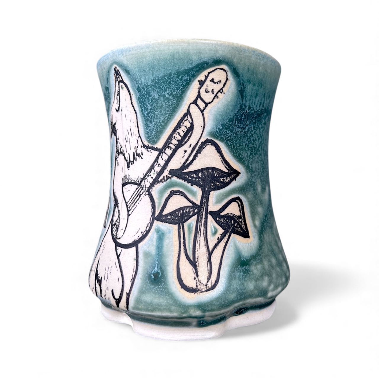 Foxy Banjo with Mushrooms Cup. This cup design was created with a linoleum carving that was transferred onto the clay surface of the cup. The printing process is imperfect and often incomplete, and so each cup is additionally hand painted making each cup one of a kind and unique. This ceramic cup is microwave safe, dishwasher safe, and made with love, and will bring an element of beauty and magic into your daily routines.