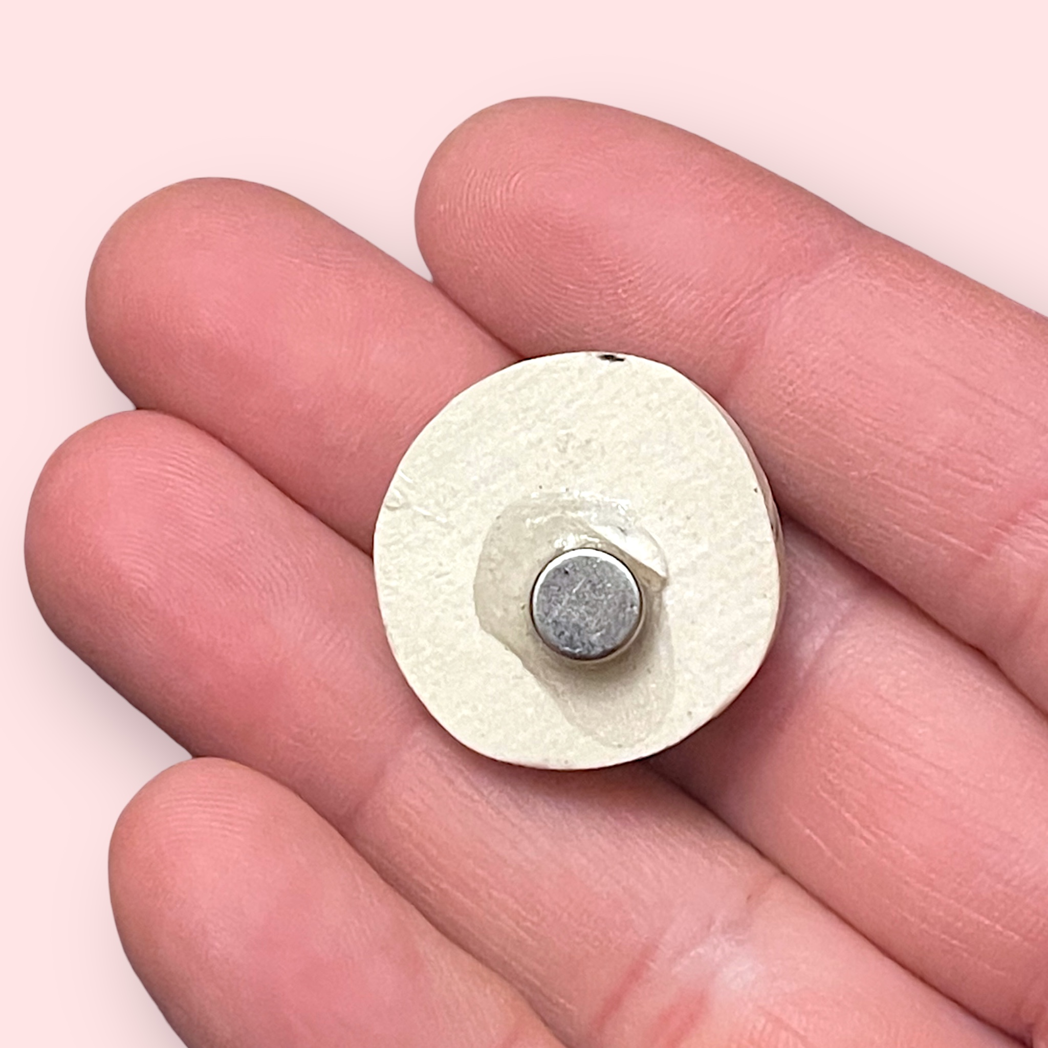Hawkmoth Magnet. This magnet was created with a stamp that was pressed into clay, cut out and then bisque fired. The clay piece was then painted black with underglaze, then wiped off to inlay the black into the grooves. It was then finished with a clear glaze. A powerful magnet was adhered after the firing.