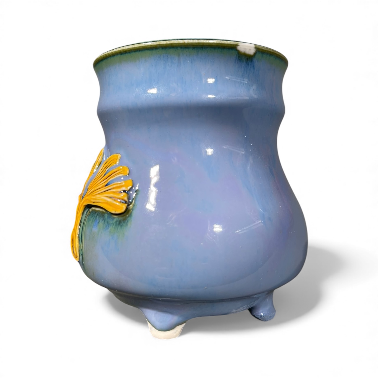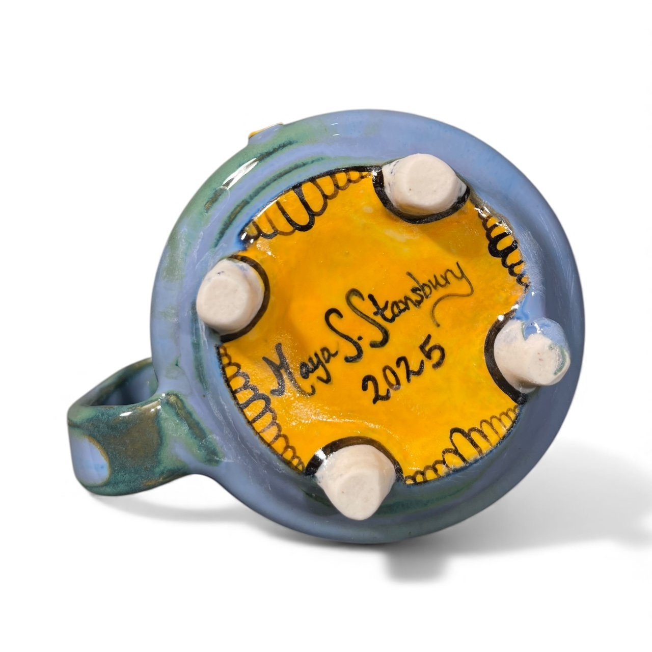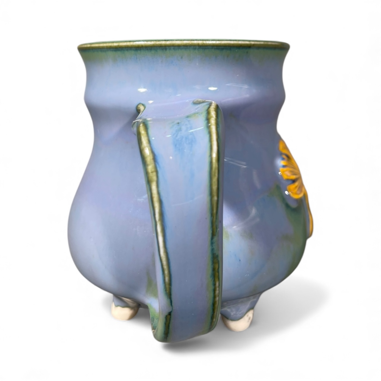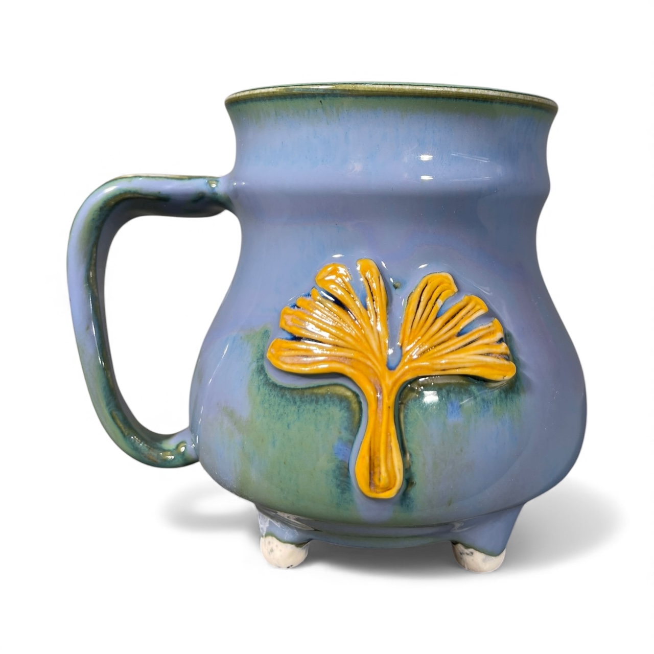 Yellow Ginko Footed Mug. This mug design was created with a linoleum carving that was pressed into clay, cut out and added to the surface of the mug. The printing process is imperfect and often incomplete, and so each design is additionally hand painted making each design one of a kind and unique. Little feet were then sculpted onto the bottom of the mug and the base was detail painted . This mug is microwave safe, dishwasher safe, and made with love, and will bring an element of beauty and magic into your daily routines.