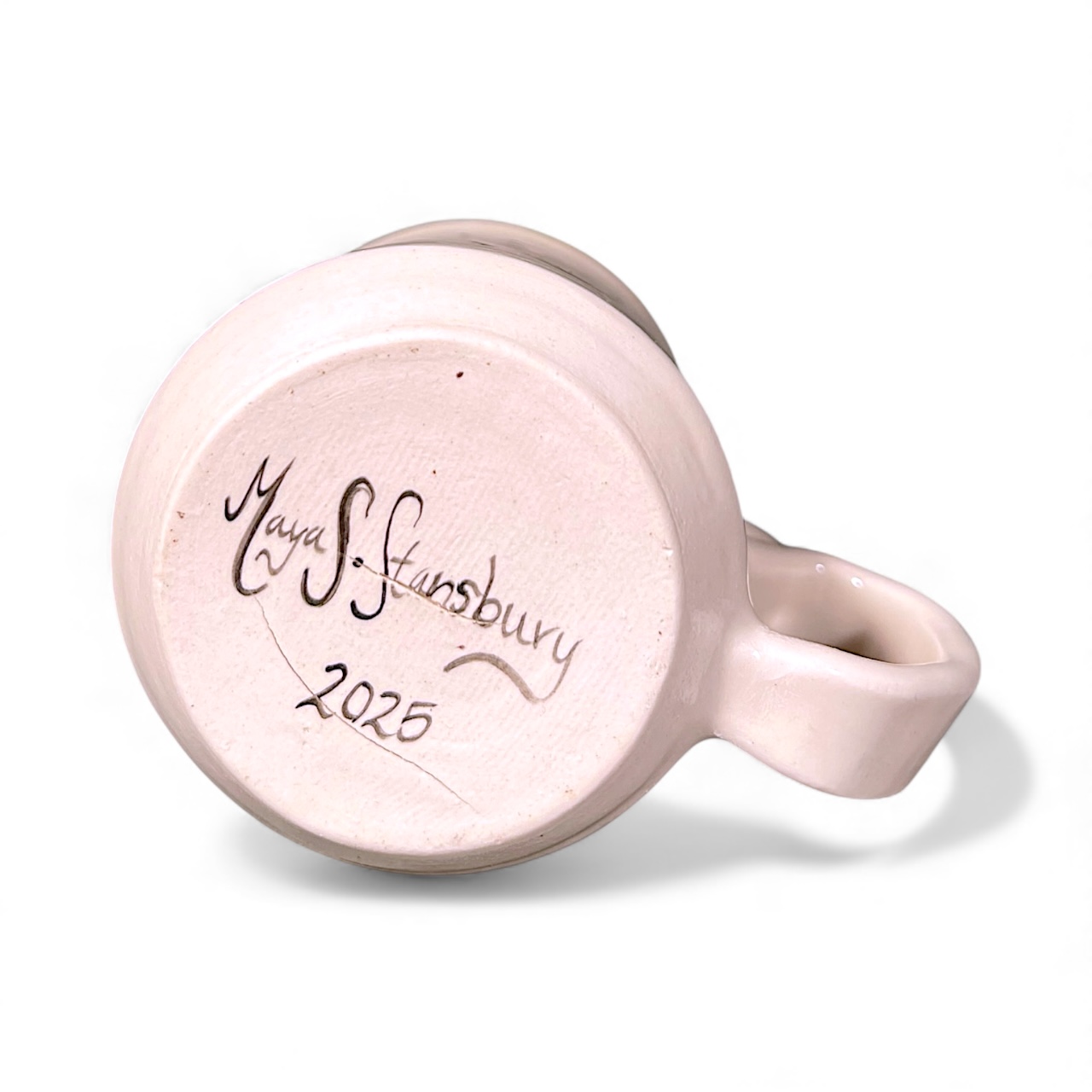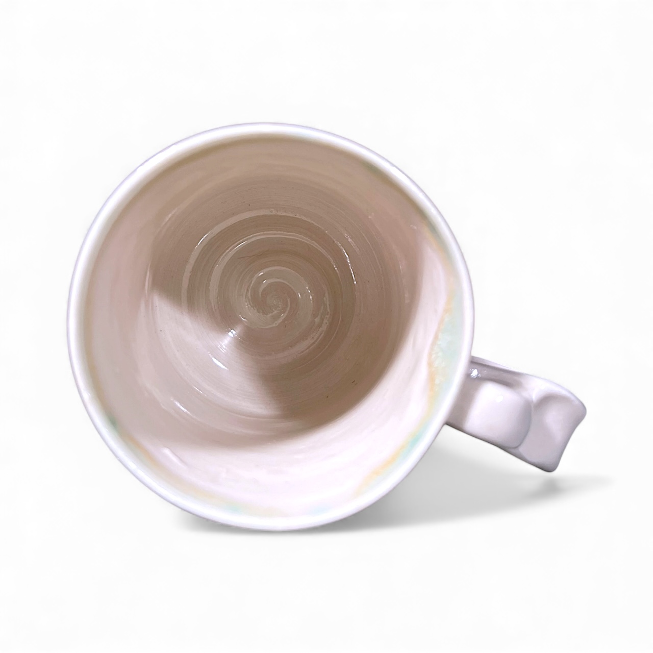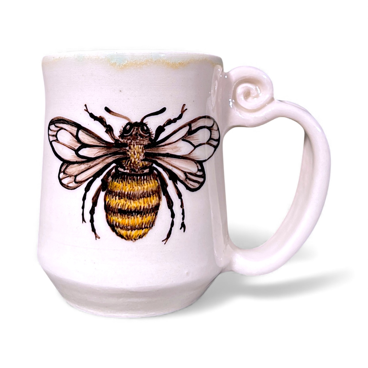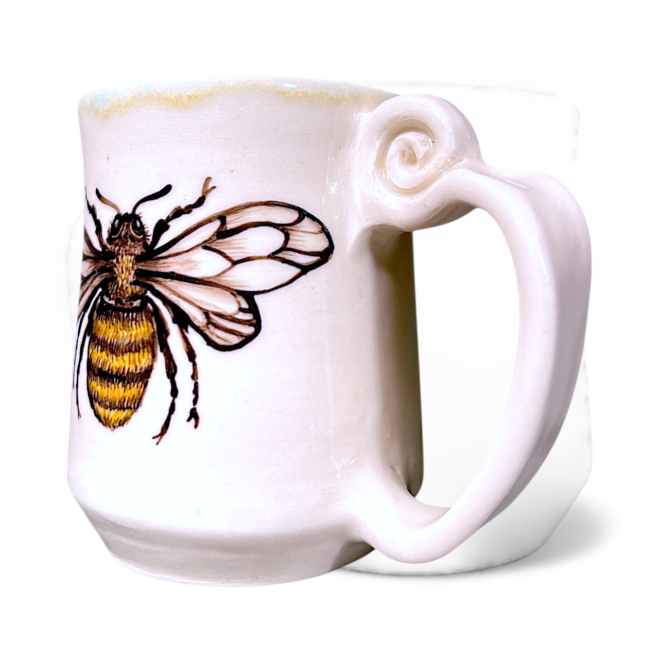 Spiral Handle Bee Mug. This one of a kind mug design was created by free-hand painting the surface with underglaze paints. It is microwave safe, dishwasher safe, and made with love, and will bring an element of beauty and magic into your daily routines.